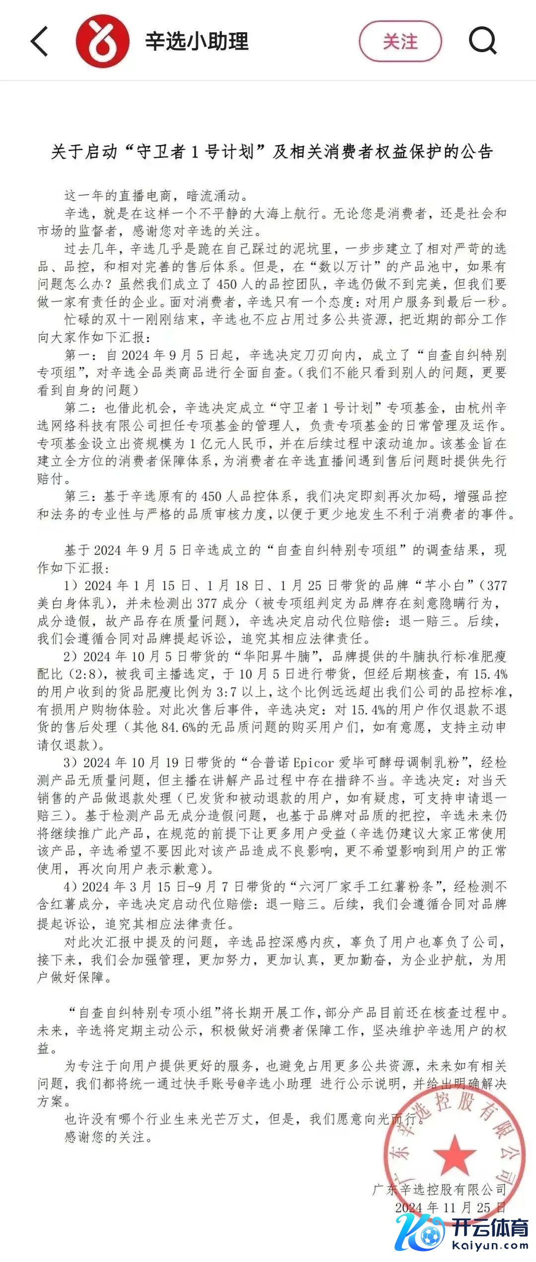 一是9月5日起,为了保险耗尽者权利,辛选竖立“自查自纠越过专项组”,对辛选全品类商品进行全面自查;