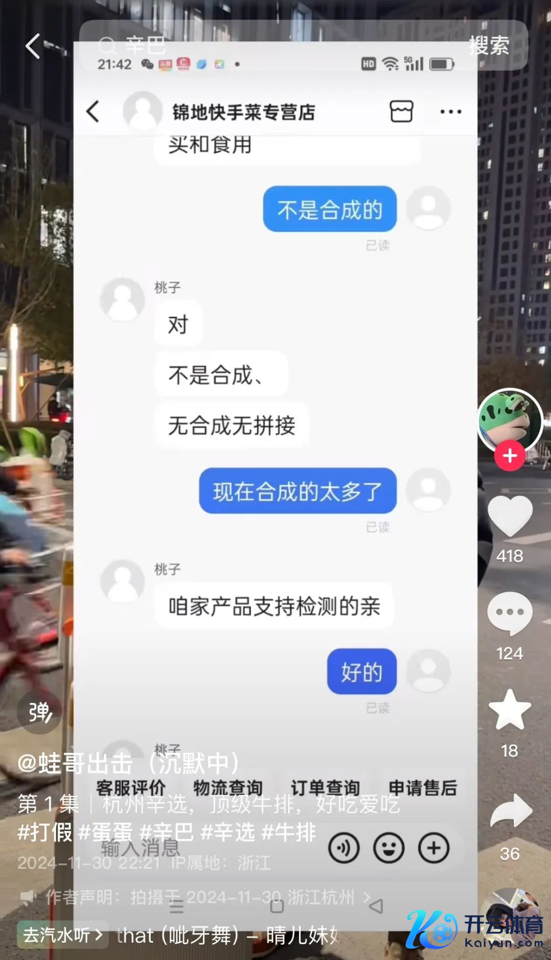 视频中,“蛙哥”晒出的聊天纪录娇傲,该牛排商家的客服否定牛排为合成拼接家具,并暗示耗尽者不错拿去检测。