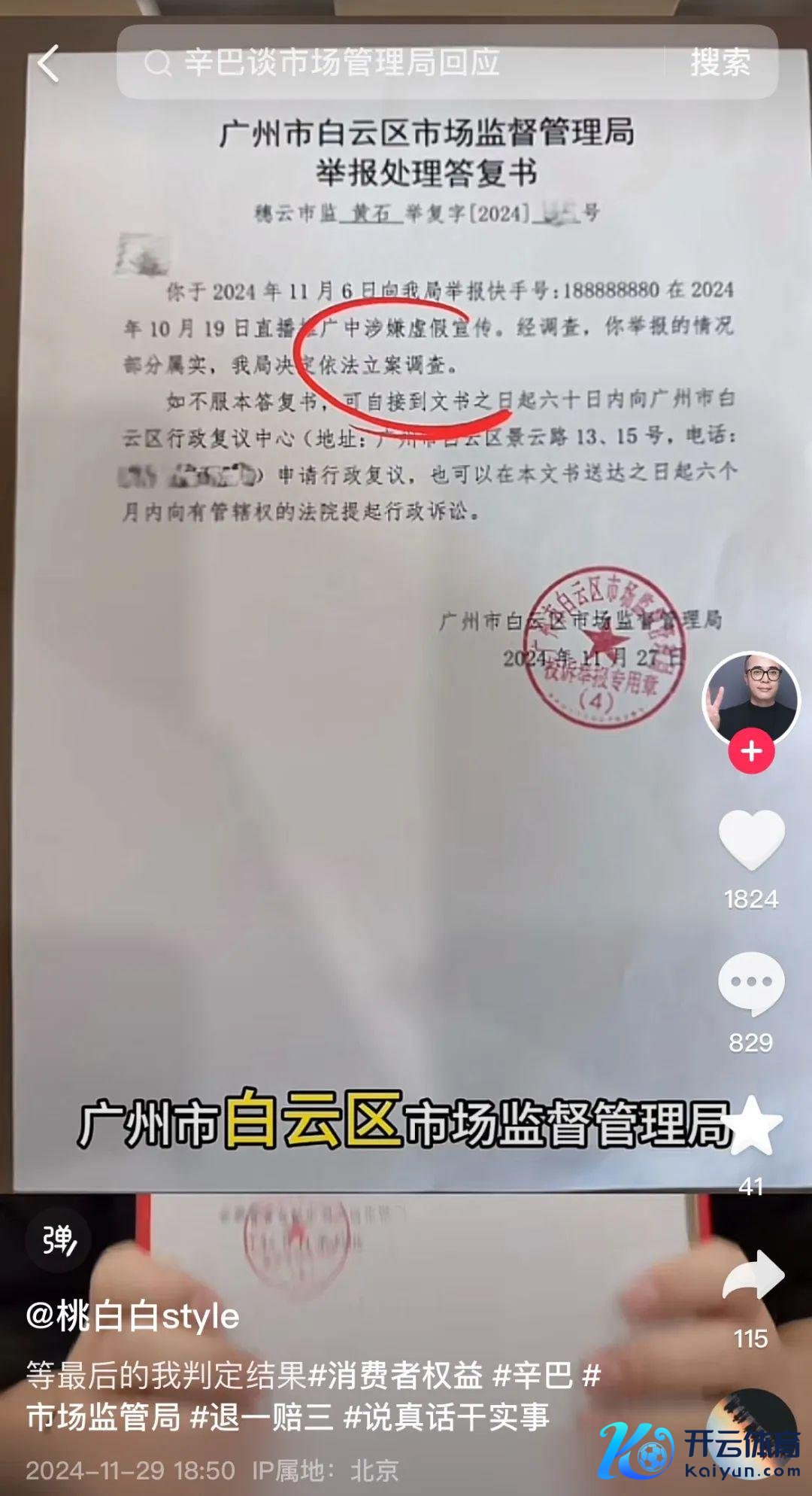 11月29日,打假博主“桃白白style”在最新发布的视频里暗示:“还是收到广州市白云区市集监督经管局举报处理回答书,辛巴10月19日直播乌有宣传经过拜访,举报的部分情况属实,决定照章立案拜访。”
