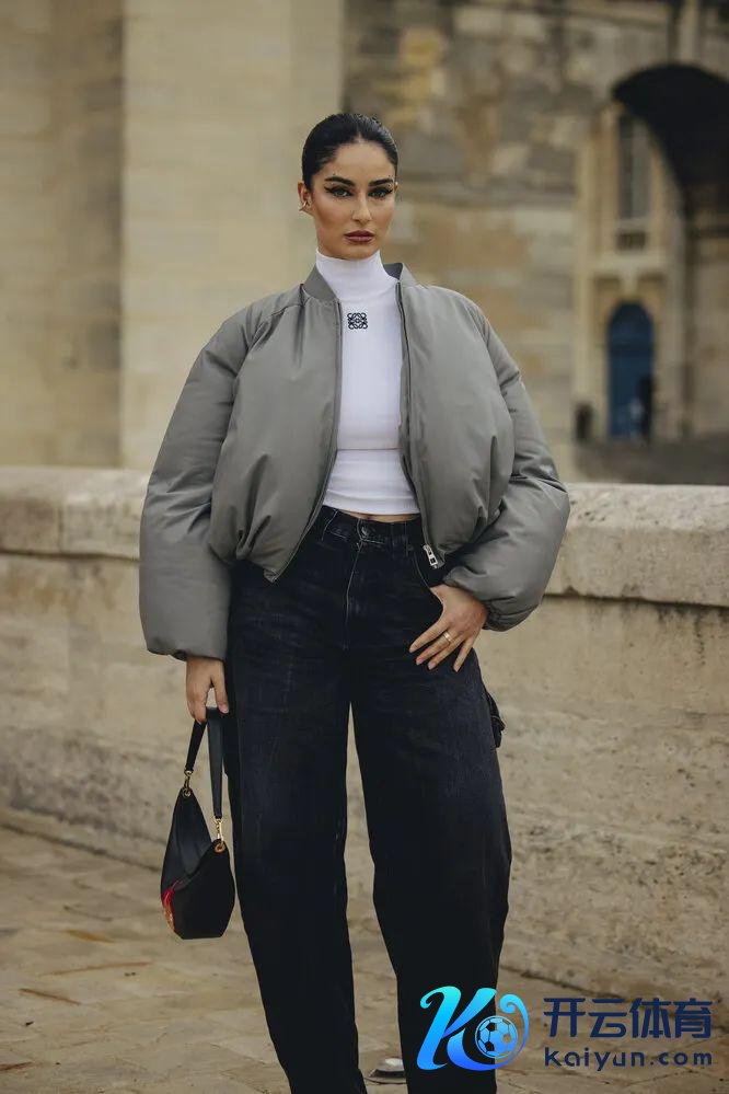 即便羽绒服莫得腰线,也不错通过内搭高腰单品升迁视觉要点。