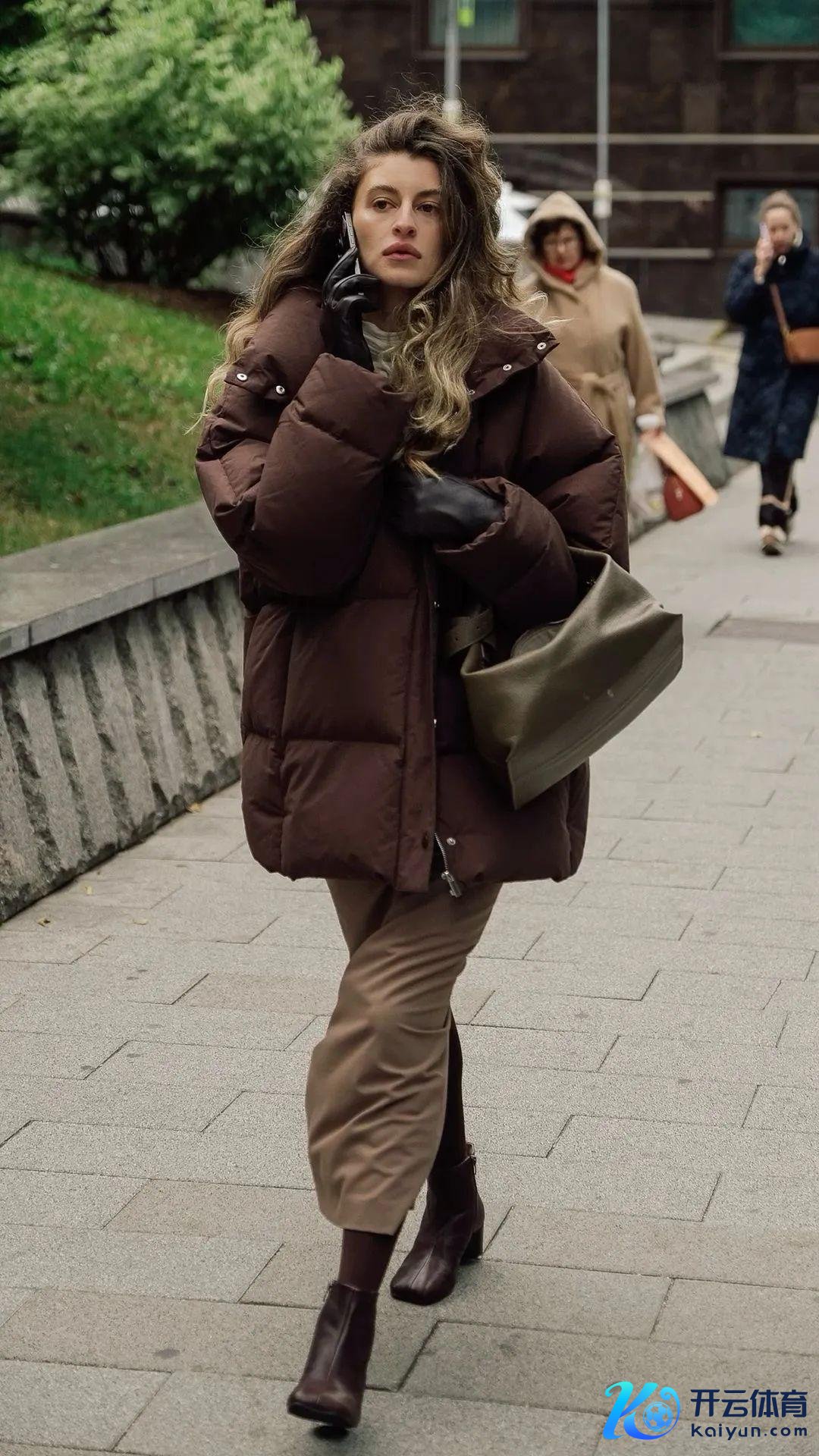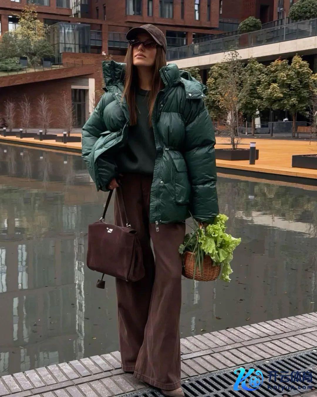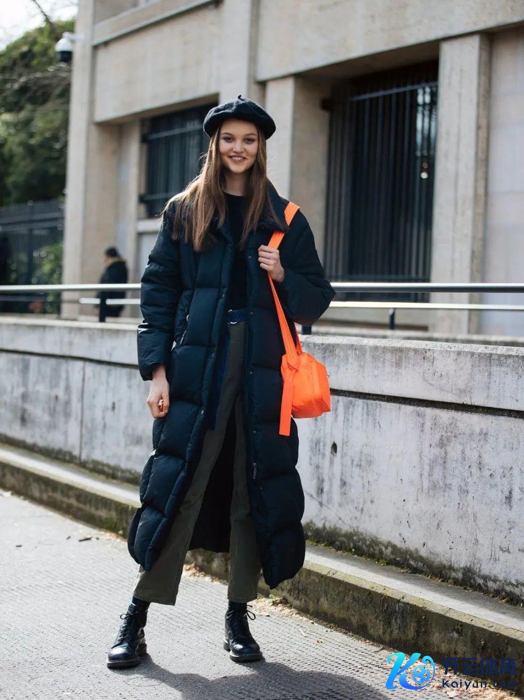 宽松的羽绒服搭配修身裤或靴子,大概在视觉上责怪下半身的概括,创造一种微细感。