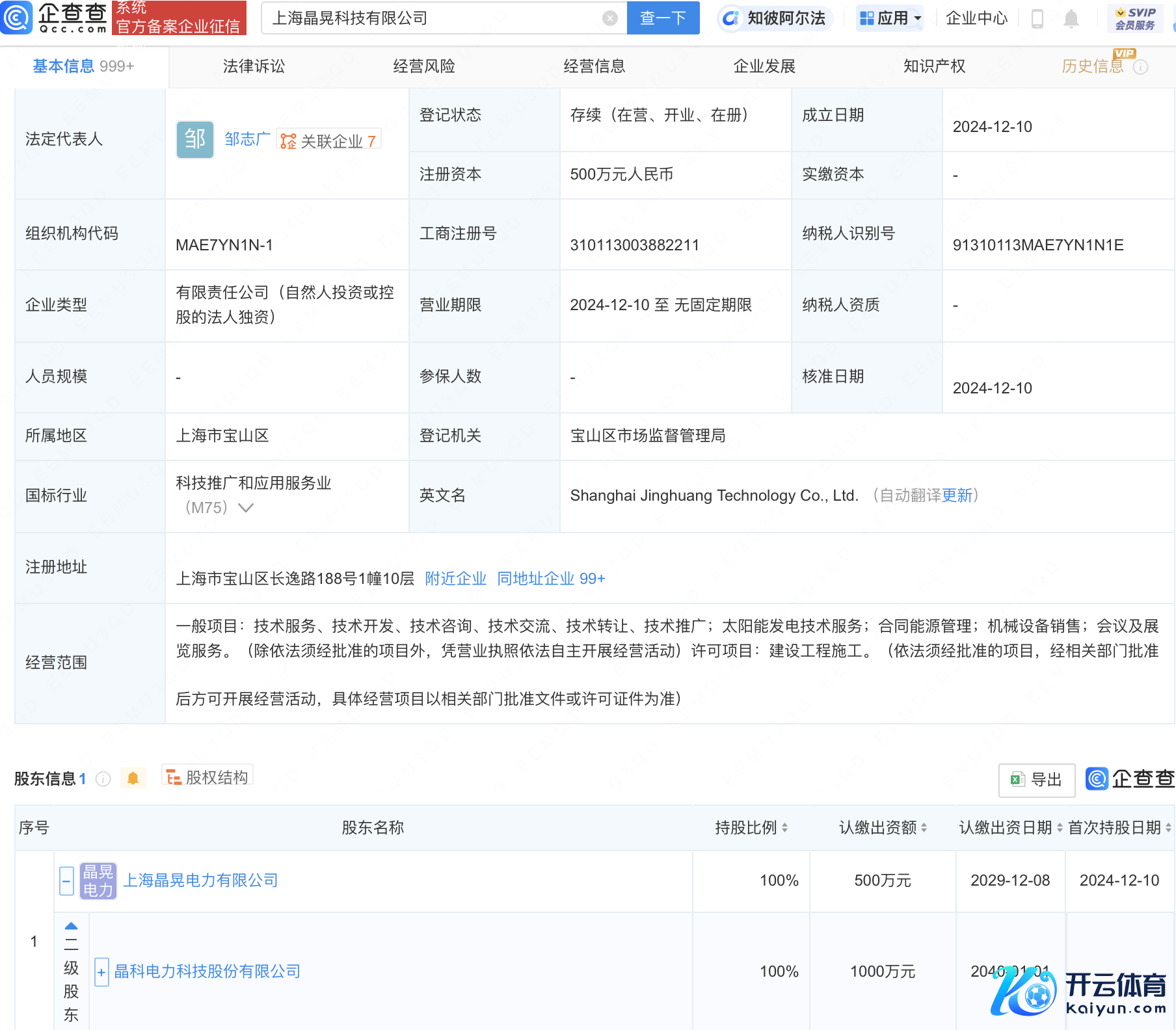 企查查APP涌现kaiyun平台登录入口,近日,上海晶晃科技有限公司诞生,法定代表东谈主为邹志广,注册成本500万元东谈主民币,计算规模包含:太阳能发电本事奇迹;公约动力处分;机械引诱销售;会议及展览奇迹等。企查查股权穿透涌现,该公司由晶科科技(601778)辗转全资合手股。