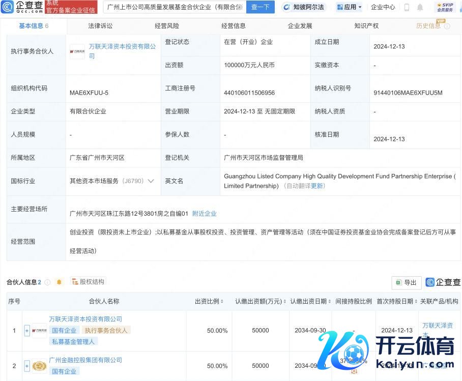 企查查APP流露,近日,广州上市公司高质料发展基金联合企业(有限联合)诞生,出资额10亿东说念主民币,贪图界限为创业投资,以私募基金从事股权投资、投资处理、钞票处理等当作。企查查股权穿透流露,该企业由万联天泽成本投资有限公司、广州金融控股集团有限公司共同出资。