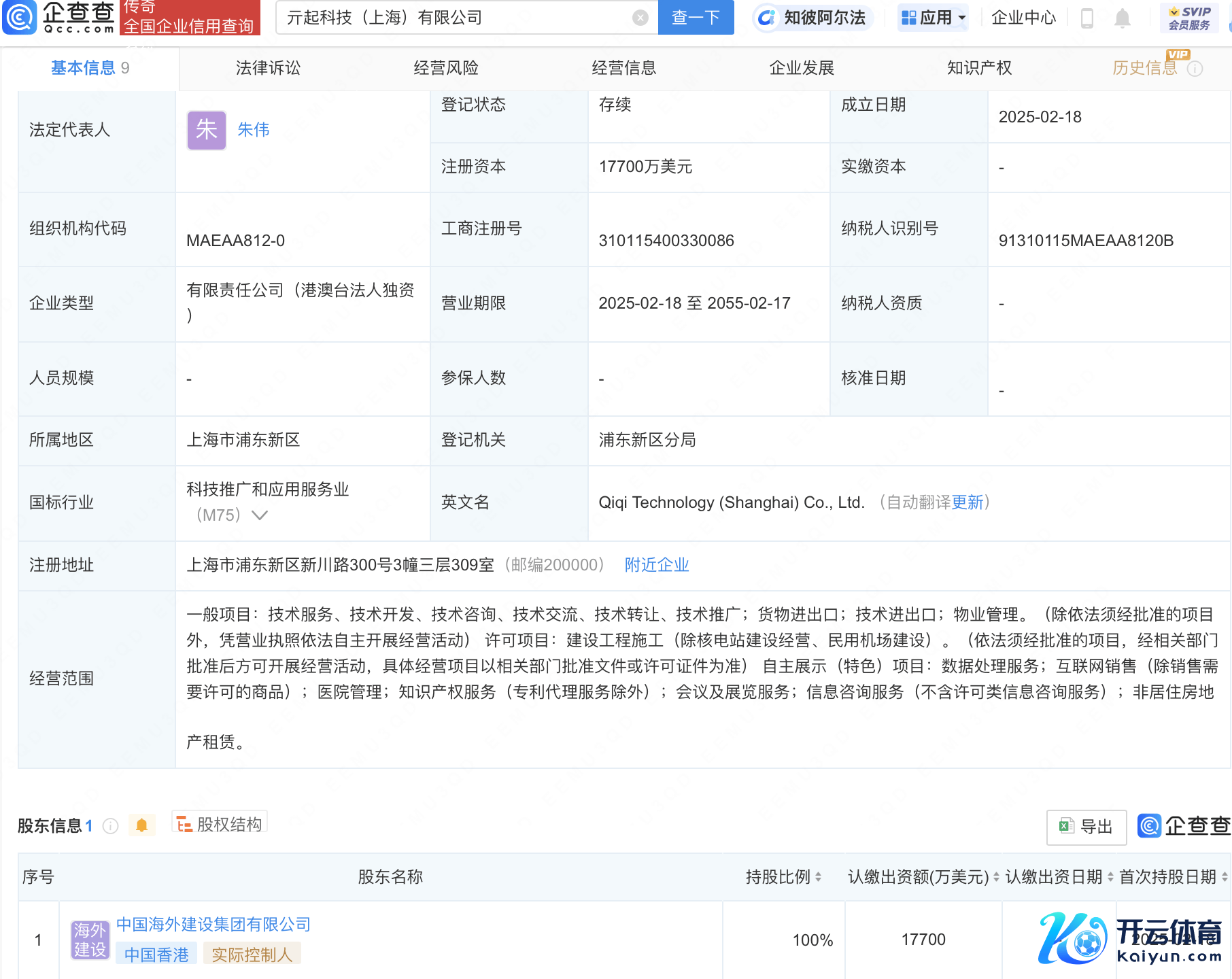 企查查APP泄露,近日,亓起科技(上海)有限公司成立,法定代表东谈主为朱伟,注册本钱1.77亿好意思元开云体育,指标边界含数据处理劳动、互联网销售、病院经管、常识产权劳动等。企查查股权穿透泄露,该公司由中国国外成就集团有限公司全资合手股。