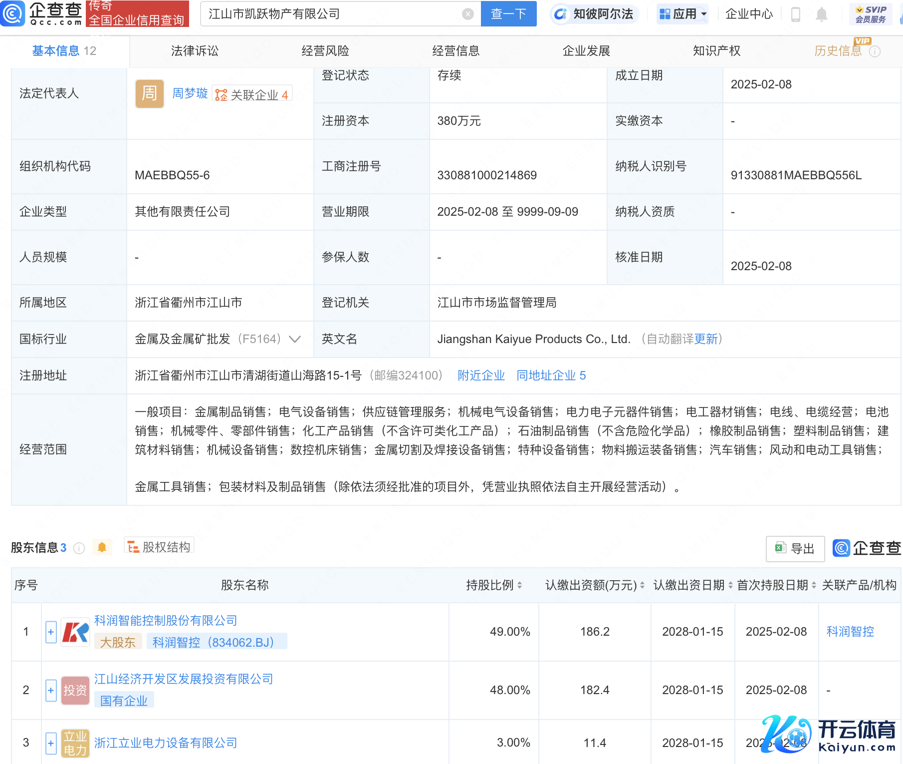企查查APP流露,近日,山河市凯跃物产有限公司开垦,法定代表东说念主为周梦璇,注册成本380万元,谋略限度包含:物料搬运装备销售;汽车销售;风动和电动器用销售;金属器用销售等。企查查股权穿裸流露体育游戏app平台,该公司由科润智控(834062)等共同合手股。