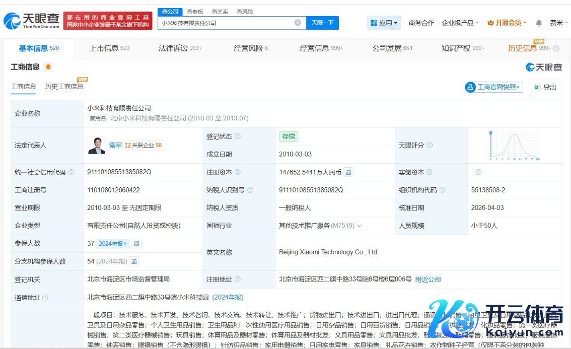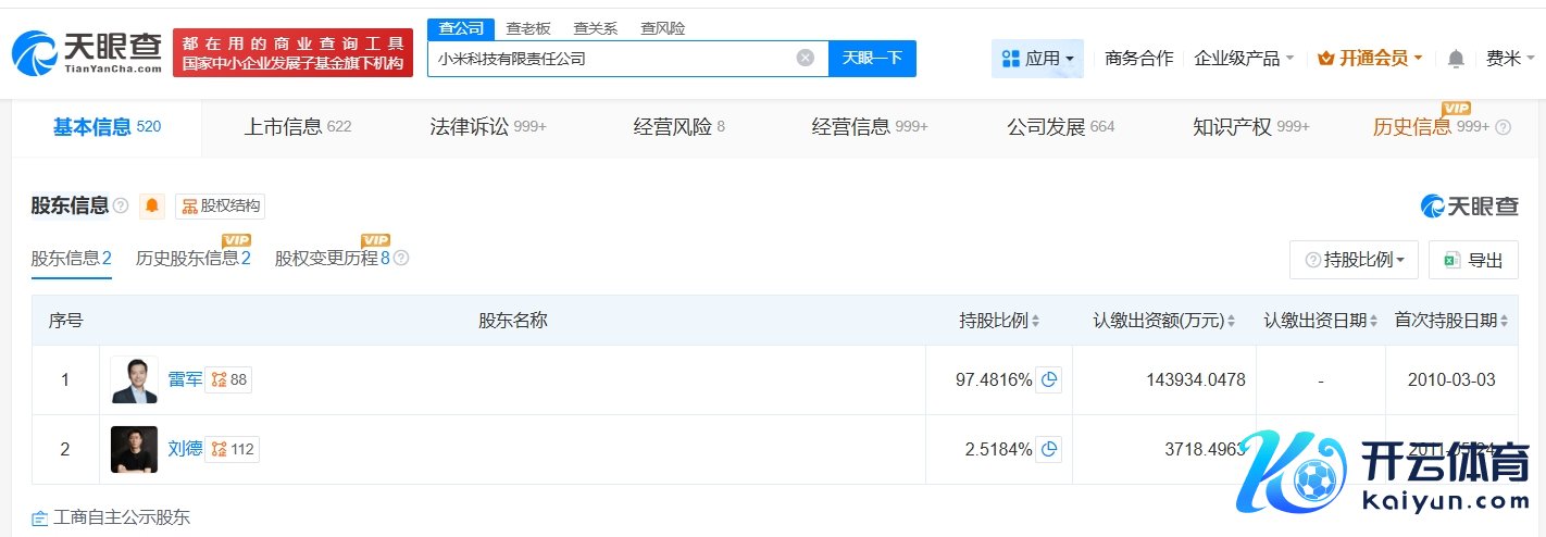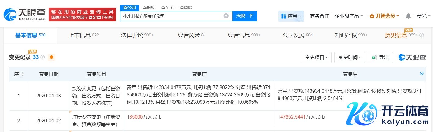 每经AI快讯,天眼查App流露开云网址,近日,小米科技有限包袱公司发生工商变更,原鼓舞小米联接创举东说念主黎万强、洪锋退出,同期,注册成本由18.5亿元东说念主民币减至约14.8亿元东说念主民币。该公司配置于2010年3月,法定代表东说念主为雷军,谋略领域包括通信斥地销售、厨具卫具及日用杂品批发、厨具卫具及日用杂品零卖等,现由雷军、刘德共同抓股。