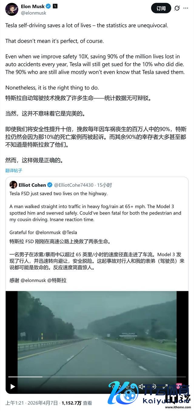 IT之家 4 月 7 日音问,特斯拉首席实施官埃隆 · 马斯克今天(4 月 7 日)在其 X 平台发布推文开云官方,为其智能扶持驾驶功能 FSD(Full Self-Driving)申辩,称该系统每年可援救 90% 的交通事故受难者,但公司仍会因剩余 10% 的致死案例靠近诉讼。