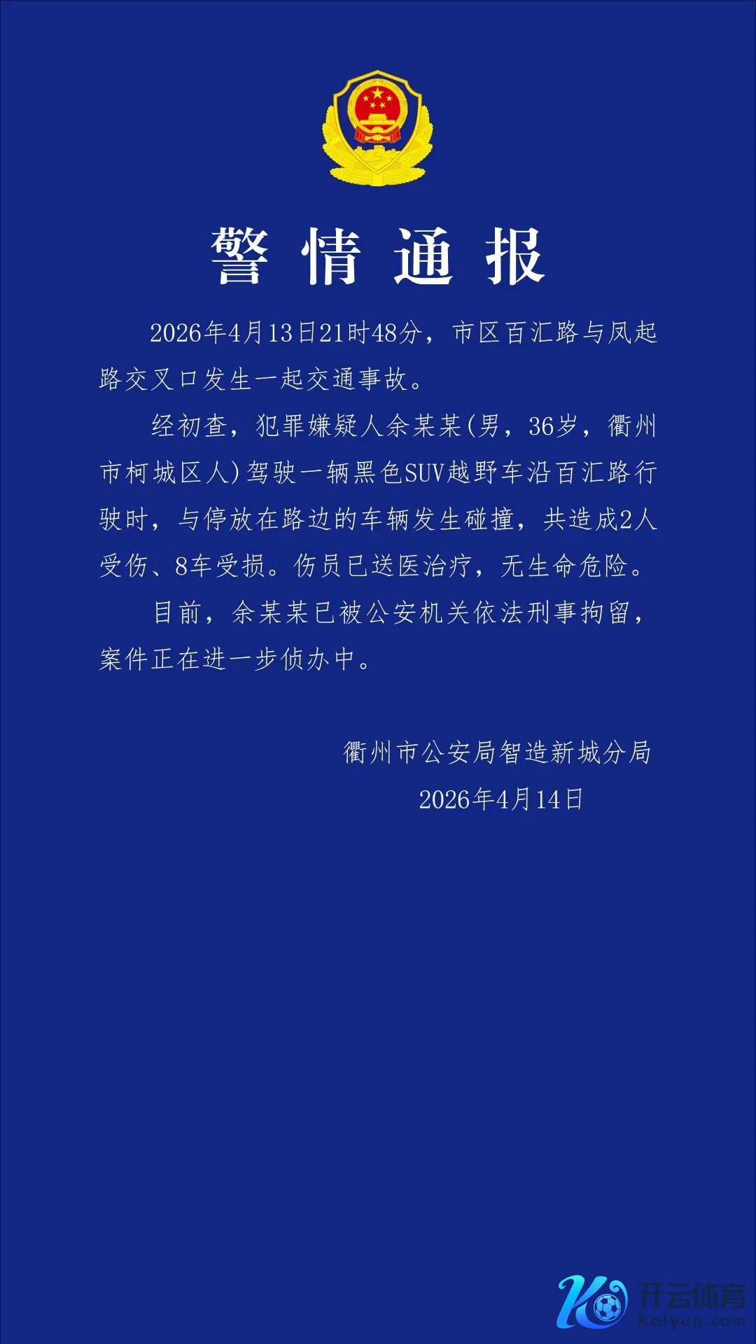 经初查,罪人嫌疑东说念主余某某(男,36岁,衢州市柯城区东说念主)驾驶一辆玄色SUV越野车沿百汇路行驶时,与停放在路边的车辆发生碰撞,共形成2东说念主受伤、8车受损。伤员已送医援手,无人命危急。